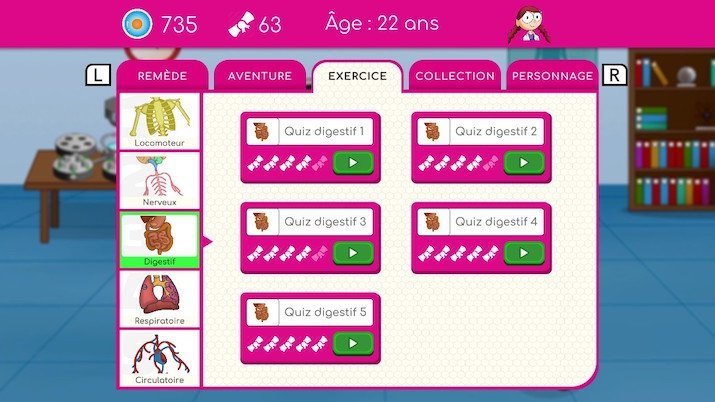 En plus de l’aventure et des quiz, tu vas récolter des badges et des cellules. Les badges te donneront accès à des fiches de personnages célèbres (médecins, scientifiques…) et d’outils scientifiques (masque, rayon X, anesthésie), pour ta culture personnelle. Les cellules vont te servir de monnaie d’échange pour customiser ton personnage (nano-skate, nano-outils, accessoire…).