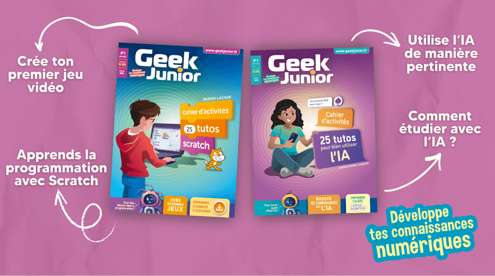 Depuis six ans, Geek Junior s’efforce de développer la culture numérique des adolescents avec son magazine. Grâce à ses nouveaux cahiers d’activités, notre ambition est d’apporter des contenus complets sur deux sujets essentiels, la compréhension de la programmation informatique et les bonnes pratiques pour utiliser l’intelligence artificielle.