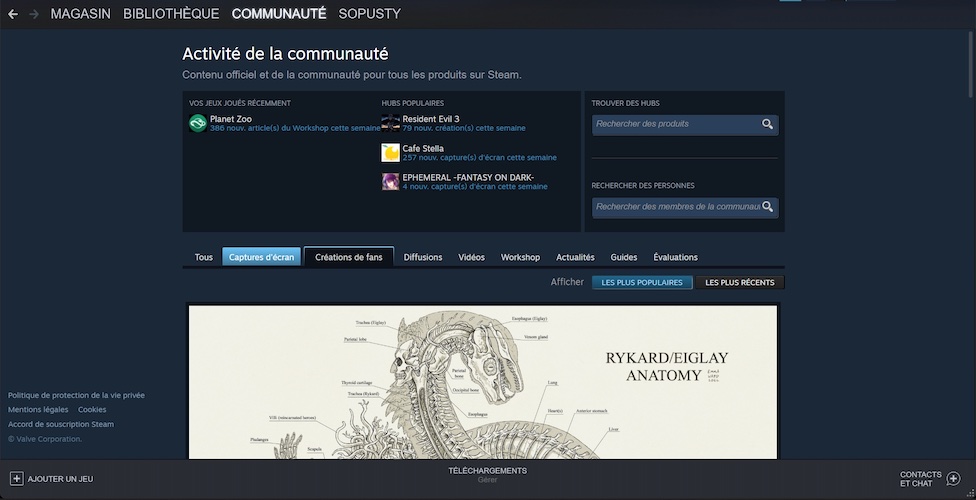 Pour faire simple, STEAM est une plateforme PC qui te sert à acheter des jeux dématérialisés, et jouer directement sur ton ordinateur. Tu as donc accès à une gigantesque bibliothèque de gaming en quelques clics. Elle est gratuite au téléchargement et lors de son utilisation. La seule chose que tu paies est le jeu que tu achètes. Mais ce n’est pas tout. La plateforme regroupe une grande communauté d’entraide, où tu vas pouvoir discuter, échanger et t’informer. 4 onglets sont disponibles : magasin, bibliothèque, communauté, et ton espace personnel.
