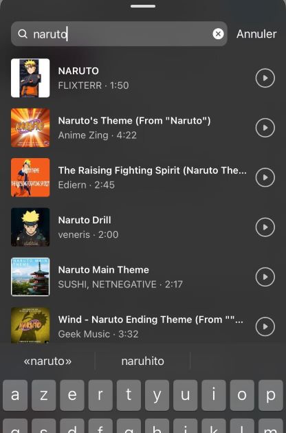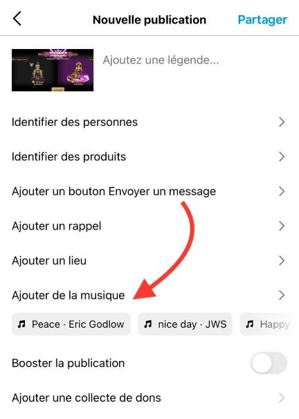 Appuie alors simplement sur l’option « Ajouter de la musique ». Sélectionne ensuite une musique, ou recherche celle de ton choix à l’aide de la barre de recherche.
