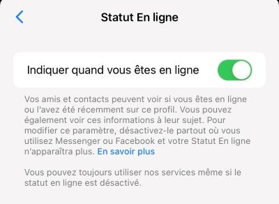 Il ne te reste plus qu’à désactiver Indiquer quand vous êtes en ligne (la pastille doit devenir grise).