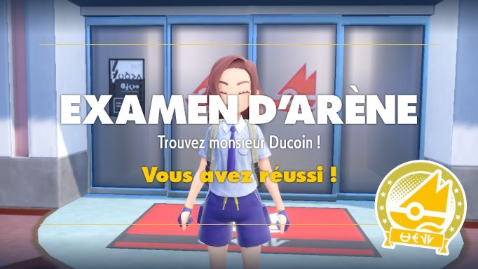 Pour participer au combat et tenter de battre la championne d’arène Mashynn la Streameuse Survoltée, tu dois faire un petit combat contre ta rivale (combat qui se lance automatiquement lorsque tu entres dans le bâtiment), puis tu dois réaliser une épreuve préliminaire : l’examen d’arène. A Levalendura, l’épreuve est de trouver monsieur Ducoin. Tu dois trouver 3 fois monsieur Ducoin (qui n’est ni plus ni moins que monsieur Clavel) dans des décors différents. Les parties de cache-cache sont accompagnées de 3 petits combats très simples contre des dresseurs lambda. Rassure-toi cette épreuve est très simple. Pour débuter l’examen, il te suffit de sortir de l’arène. Là un dialogue avec Mashynn se lancera automatiquement. Une fois terminé, retourne dans le bâtiment de l’arène.