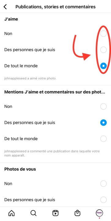 Depuis le menu Notifications, tu vas donc pouvoir gérer les catégories et sous-catégories de notifications que tu ne souhaites plus recevoir : followers, messages, appels, publications, commentaires… Lorsque tu sélectionnes une catégorie, par exemple ici Publications, stories et commentaires, tu as accès des sous-catégories : j’aime, mentions j’aime et commentaires sur des photos. Pour chacune de ces sous-catégories, tu peux choisir de ne recevoir aucune des notifications, toutes les notifications, ou bien les notifications des personnes que tu suis uniquement.