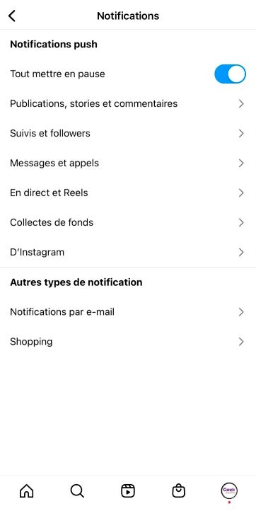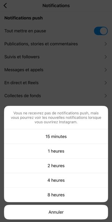Pour stopper rapidement toutes les notifications, active simplement sur Tout mettre en pause. Choisis ensuite la durée de l’arrêt des notifications push : 15 minutes, 1 heure, 2 heures, 4 heures ou 8 heures. Pour arrêter indéfiniment les notifications Instagram, fais-le directement depuis les réglages de ton téléphone.