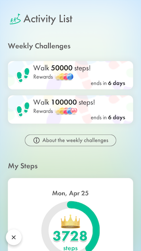 Le Défi Hebdomadaire de cette semaine est d’atteindre le nombre de pas indiqué dans le thème du moment avec tes amis. Tu reçois des récompenses en participant au Défi Hebdomadaire en groupe et en atteignant l’objectif. Même en cas d’échec, chaque joueur reçoit un bonus de participation. Plusieurs types de défis s’ajouteront au fur et à mesure.