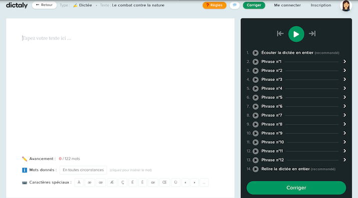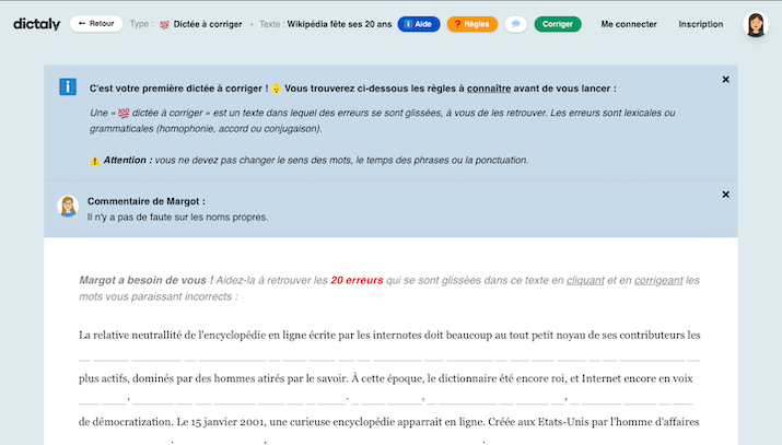 Pour commencer, inscris-toi gratuitement. Cela te donne accès à toutes les fonctionnalités. Tu pourras donc faire des dictées, avoir les corrections instantanées, et même la possibilité de pouvoir te mesurer à d’autres joueurs. D’autres nouveautés arriveront bientôt comme par exemple des dictées de mots, des textes à trou ou encore des exercices de français sur des règles spécifiques. Si tu as la moindre question un forum et une FAQ sont là pour toi.