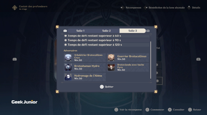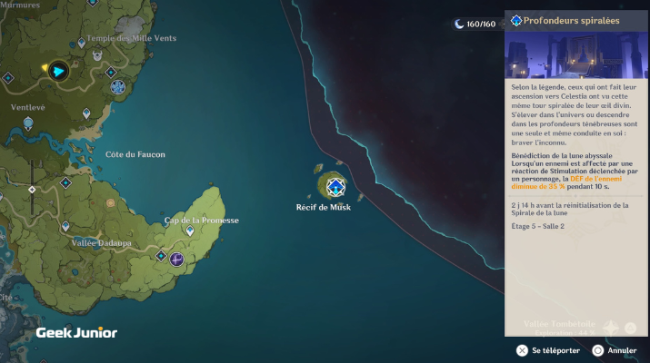 Si tu as déjà complété cet étage, tu n’as pas a le faire de nouveau, tu obtiens directement la récompense. Si tu ne l’as pas encore fait, rends-toi dans les Abysses. Elles se situent à l’est de la Cité de Mondstadt sur la carte, sur le Récif de Musk (screenshot n°1). Une fois entré dans les Abysses, sélectionne l’étage numéro 4 et complète la troisième salle (screenshot n°2). Une fois fait, rends-toi sur le menu des évènements en cours (« Rideau de feuilles ») et récupère ton cadeau !