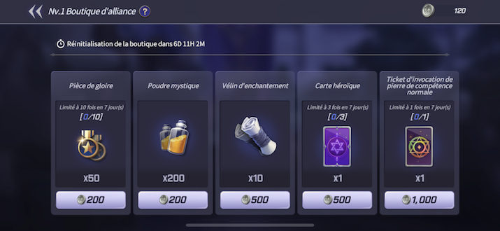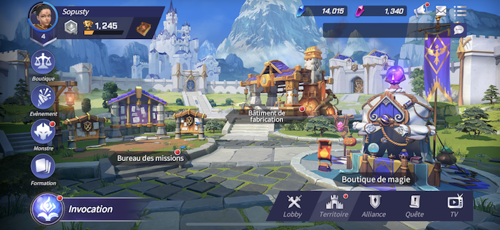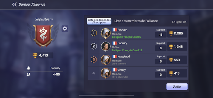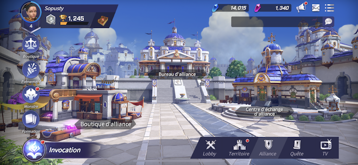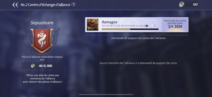 Tu peux rejoindre ou créer une alliance. Celle-ci fonctionne comme une guilde. Tu pourras y échanger tes cartes, demander certaines cartes et en donner, entre les membres de ton alliance. Une boutique est également disponible avec des cartes, des pièces d’invocation, de la poudre mystique… Si tu veux rejoindre mon alliance, rends-toi dans le bureau d’alliance et recherche « Sopusteam ». Vous êtes tous les bienvenus !