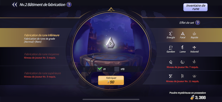 Tu peux mettre trois runes sur un monstre. Celles-ci vont augmenter l’attaque, la défense, la vie, la vitesse, le taux critique, les dégâts critiques, la précision et la résistance de ta carte. C’est donc indispensable d’en mettre sur toutes tes cartes. Les runes se fabriquent dans le bâtiment de ton territoire (voir plus bas dans l’article). Tu peux aussi ajouter une pierre de compétence, que tu gagneras dans les invocations.