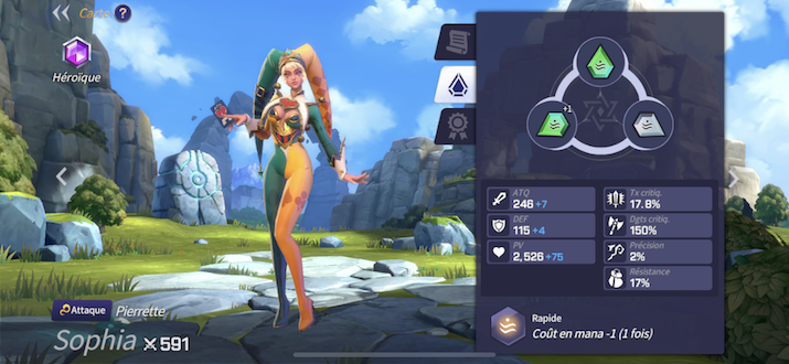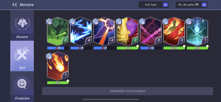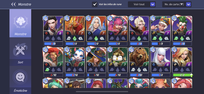 Il existe quatre niveaux de cartes : normal, rare, héroïque et légendaire. Comme tu te doutes, plus le niveau est élevé plus les statistiques sont plus fortes. Cependant ce sera plus compliqué de les améliorer. En effet, pour améliorer une carte il faut lui donner un doublon. Lors d’un combat, plus la carte est forte, plus elle coutera du mana pour l’utiliser (entre 2 et 6).
