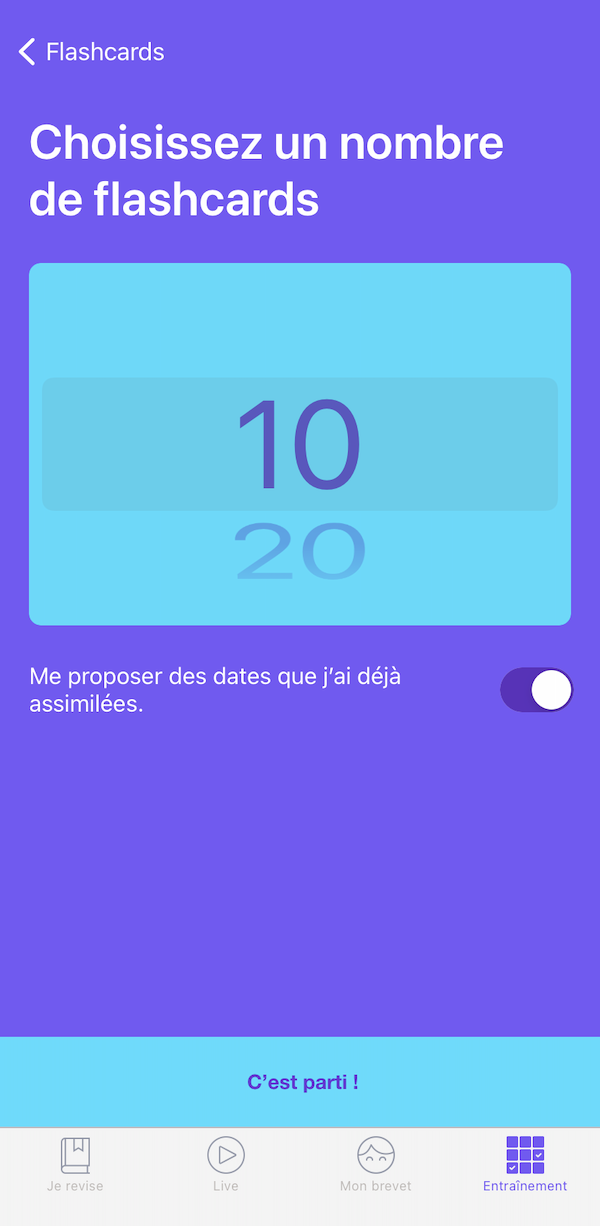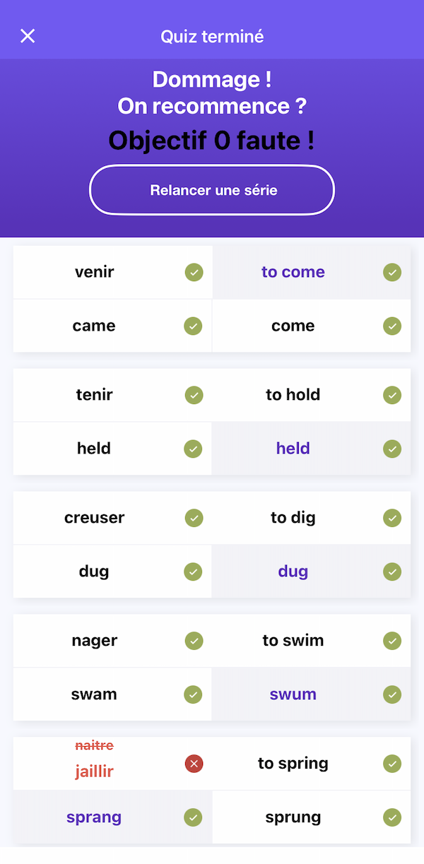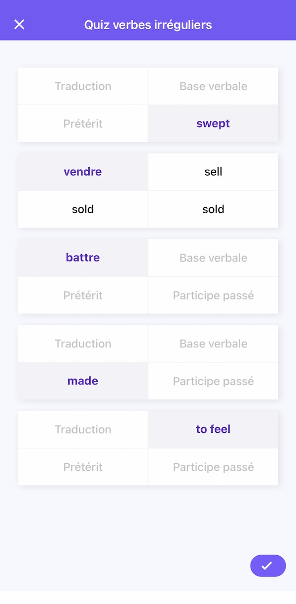 Cette partie dispose de deux catégories : les verbes irréguliers en anglais et les flashcards d’histoire. Avec des mini séries de quelques verbes ou cartes, tu peux t’entrainer jusqu’à faire un sans-faute. L’avantage est que pour bien retenir rien de mieux que de travailler un peu tous les jours.