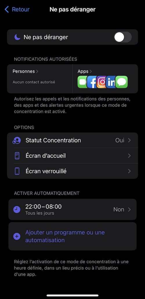 - Si tu actives le mode repos et que quelqu’un t’envoie un message, celui-ci pourra voir que tu as un mode de concentration activé.