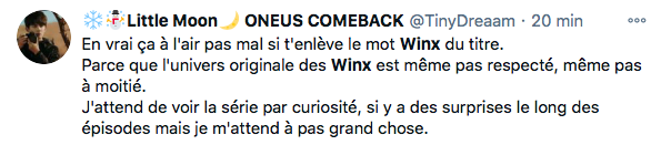 L’annonce de la sortie de la saga des Winx a remué la toile. En effet, l’ethnie et l’apparence de toutes les fées n’ont pas été totalement respectées. Pour ce qui est de Flora, celle-ci ne sera pas dans la saison 1 mais fera son apparition dés la prochaine saison. Malheureusement Techna manquera à l’appel pour cette série, elle a été jugée trop « cliché » (oui, on est super triste aussi). Voici un exemple de vos avis sur la controverse :
