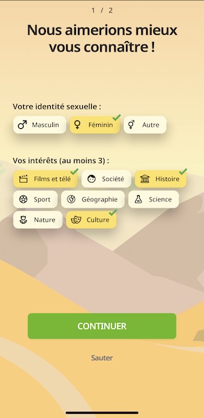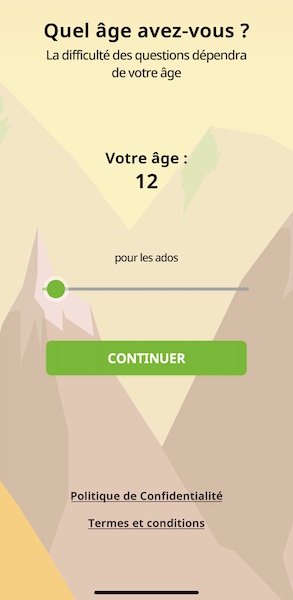 Avant de démarrer, le jeu te demande ton âge. En fonction de celui-ci, la difficulté des questions s’adapte. Aussi, tu peux entrer tes centres d’intérêt. Dans un premier temps, tu passes un test, afin d’évaluer tes compétences, et rendre le jeu le plus amusant et intéressant pour toi. Tu vas répondre aux questions, et pour chacune d’entre elles, noter le niveau de difficulté selon toi. Ensuite, tu peux commencer à jouer.