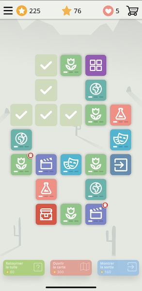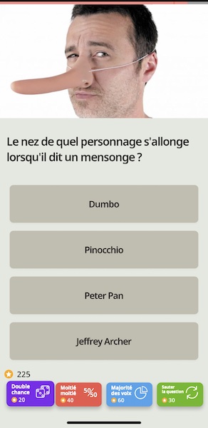 Tu vas alors évoluer le long d’une map à la Candy Crush, et passer les niveaux. Les premiers niveaux sont très simples. Mais plus tu vas avancer dans le jeu, plus les questions vont se corser. Mais pas de panique, tu peux modifier à tout moment le niveau de difficulté. Pour t’aider tu as même des bonus pour répondre correctement : le 50/50, la réponse la plus choisie, et la seconde chance. SI tu te trompes, tu perds une vie. Tu en as 5 au total, qui se rechargent au fur et à mesure.