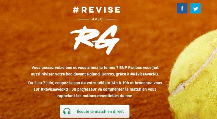 Pour pouvoir continuer à regarder les derniers matchs de Roland-Garros sans culpabiliser et sans prendre trop de retard sur tes révisions, il faut aller sur le site Le Guide Ultime de la vie étudiante (lancé par la banque BNP Paribas) et aller sur la page Révise aved RG.