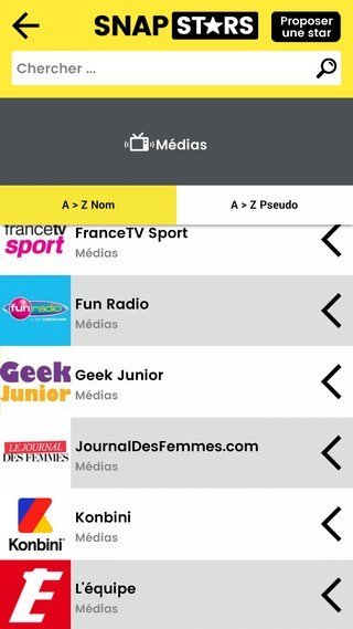 Outre les célébrités de la TV réalité, tu peux aussi y trouver des chanteurs, des acteurs, des YouTubeurs et des sportifs. Une catégorie très intéressante est celle consacrée aux médias. Tu vas pouvoir ainsi suivre tous les médias qui ont un compte Snapchat très rapidement.