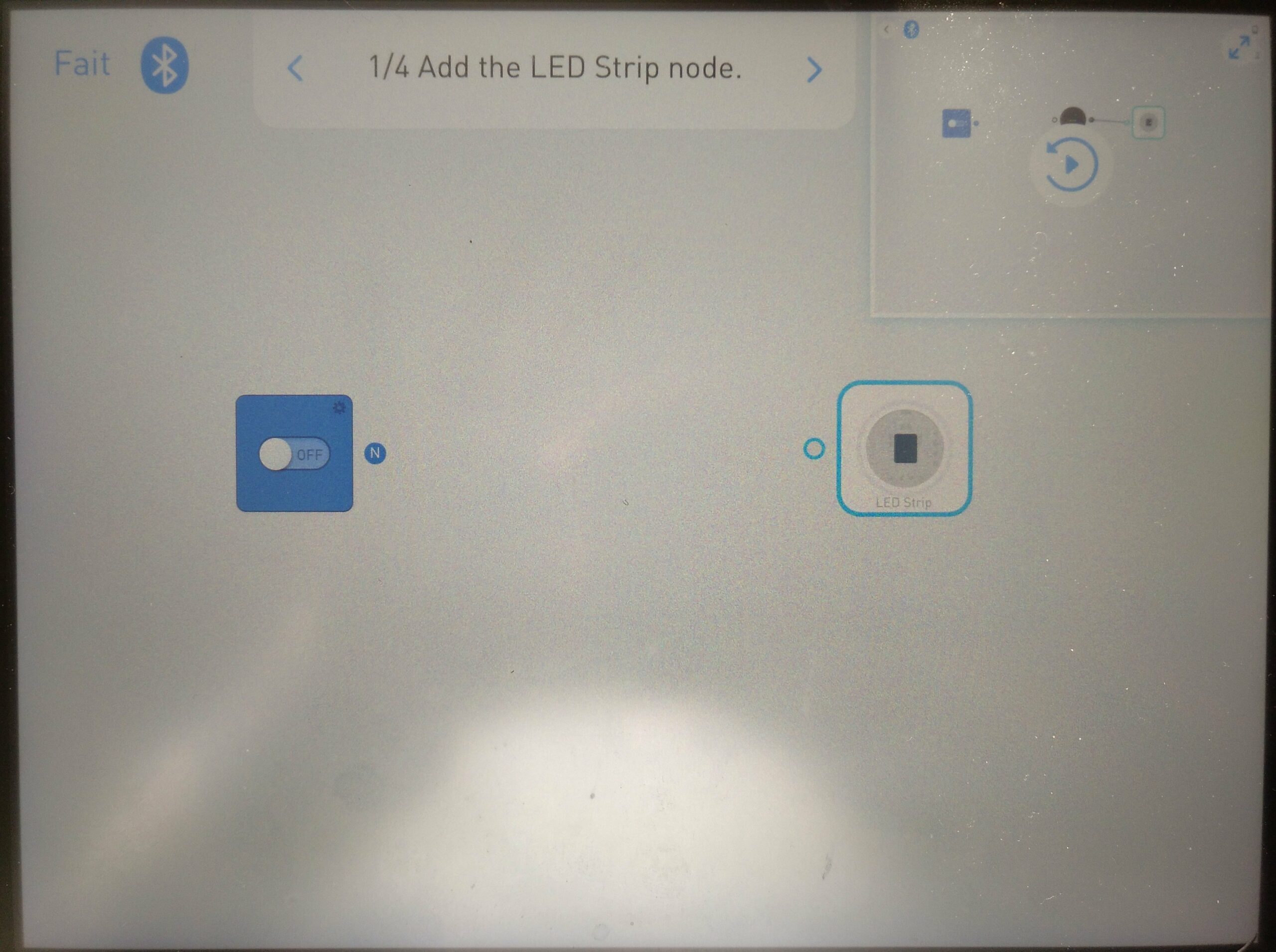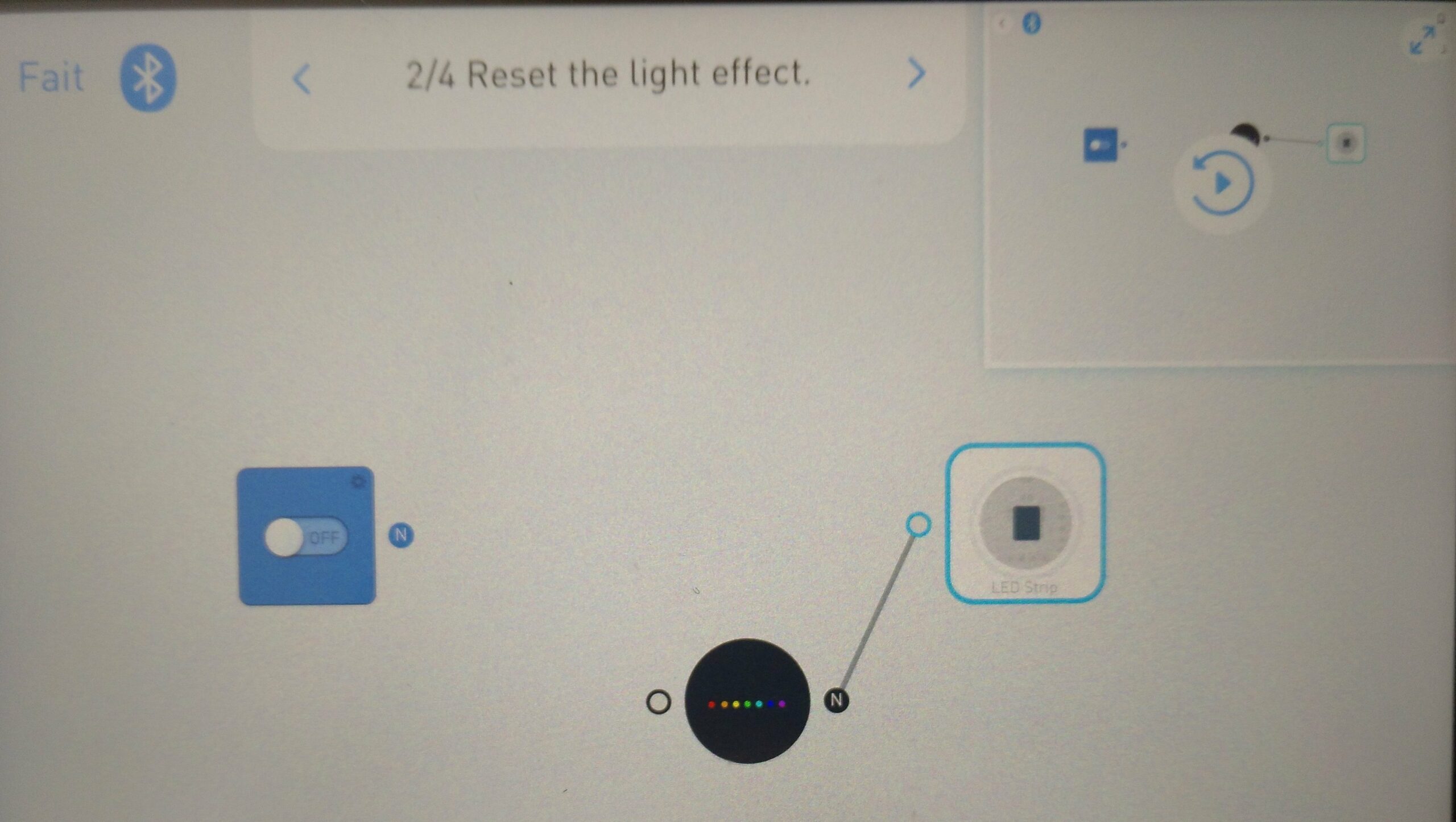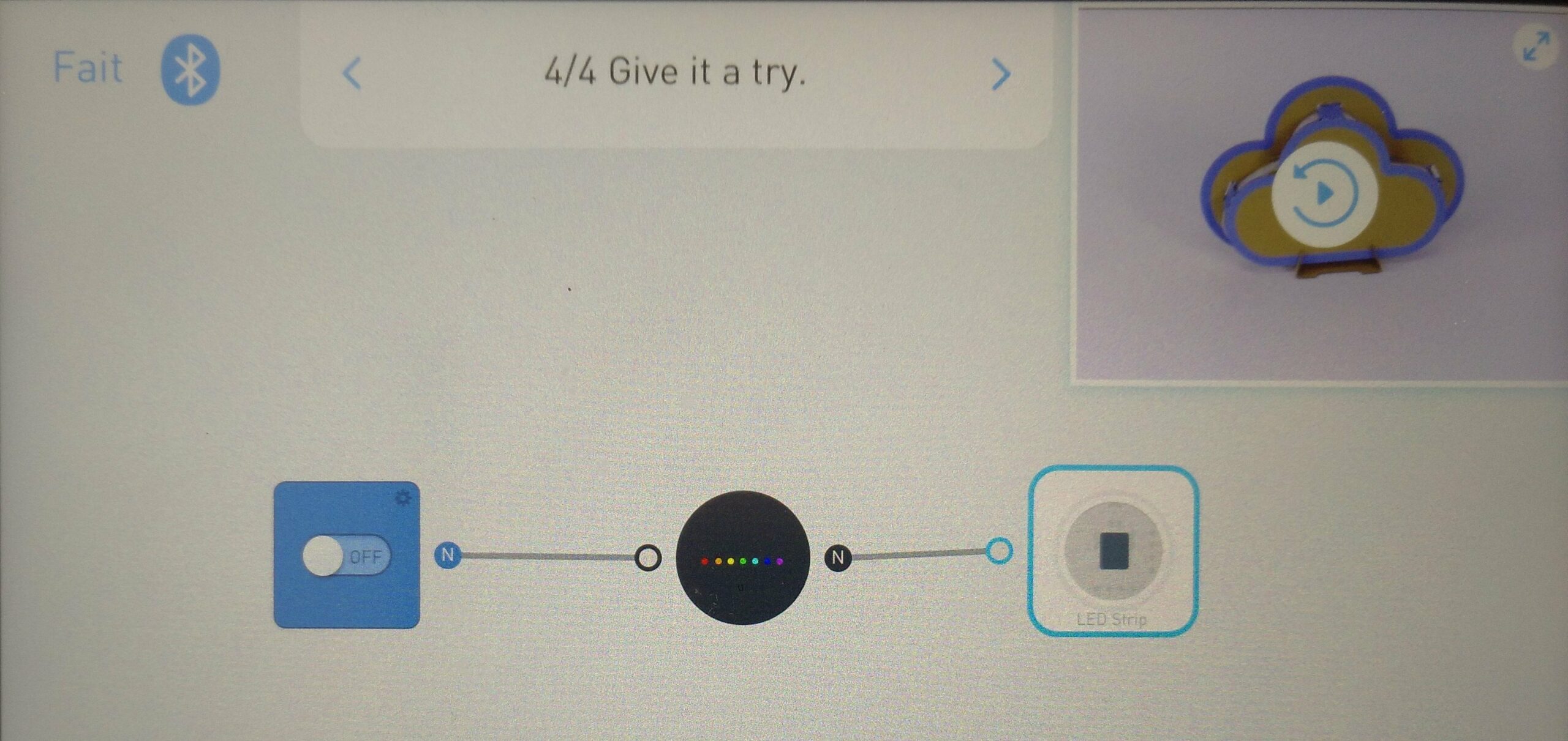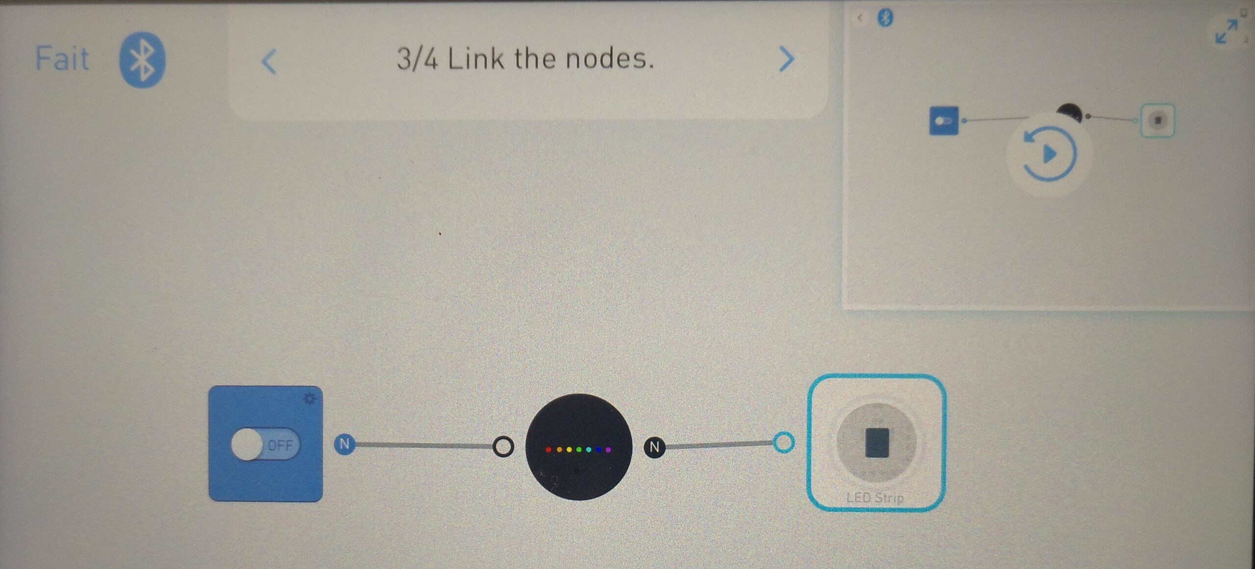 Il suffit de glisser/déposer les éléments et de réaliser les connexions sur le même principe. Remarquez les petites animations en haut à droite des différents écrans. Une fois terminé, on peut profiter d’un joli nuage lumineux.
