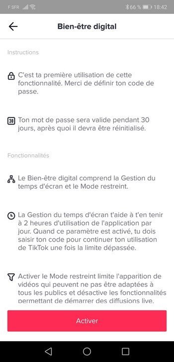Enfin, TikTok dispose de plusieurs options pour gérer au mieux la vie privée de ses utilisateurs comme pour Instagram par exemple. Une option appelée « Bien-être digital » permet de limiter le temps d’utilisation par jour à deux heures maximum. Mais, sur ce point, l’application pourrait faire beaucoup mieux.