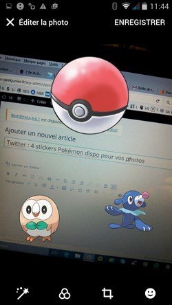 Pour l’instant, seul Rindibou, Flamiaou, Otaquin et la Pokéball sont disponibles. Tu peux les ajouter facilement quand tu prends une photo depuis l’application Twitter. Tu peux bien sûr les positionner comme tu veux et changer leur taille.